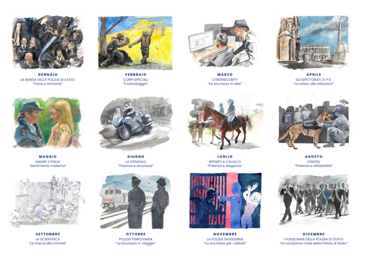 Le 12 tavole che illustrano il calendario, ripropongono l’immagine del nostro lavoro sia nella quotidianità operativa sia in aspetti meno rappresentati ma non per questo meno significativi, come ad esempio “La banda della Polizia di Stato” che con la sua potenza ed armonia esalta il senso identitario della nostra Istituzione. Ed ancora l’immagine “madre e figlia” che racchiude l’intima dolcezza del rapporto materno delle donne della Polizia di Stato, forti ma sempre umane. Non da ultimo “Funzionari di Polizia che sfilano”, a rappresentare efficacemente la vocazione di Polizia civile al servizio dello Stato e dei cittadini.